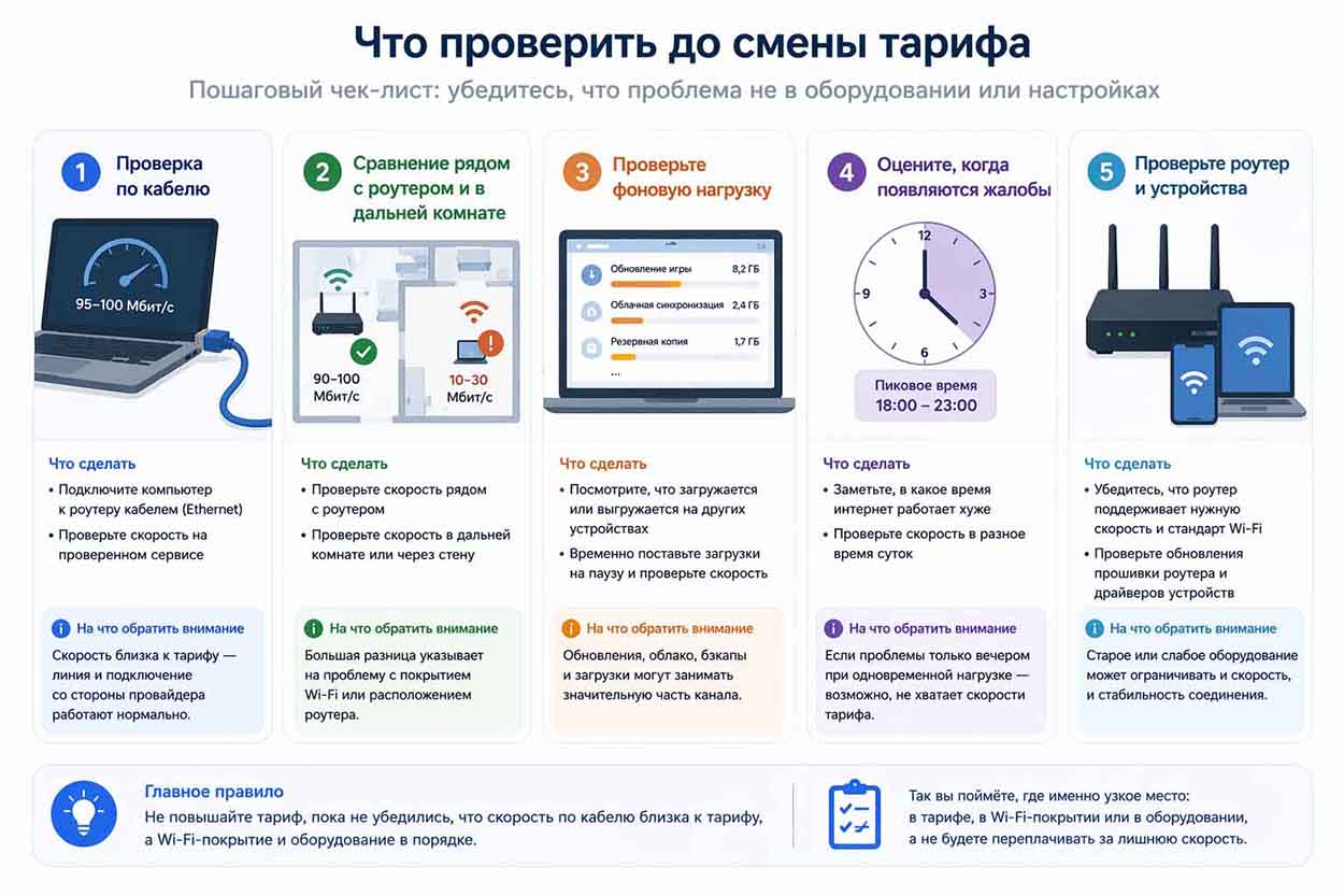 Перед сменой тарифа сначала проверяют линию по кабелю, покрытие Wi-Fi, фоновую нагрузку и возможности домашнего оборудования